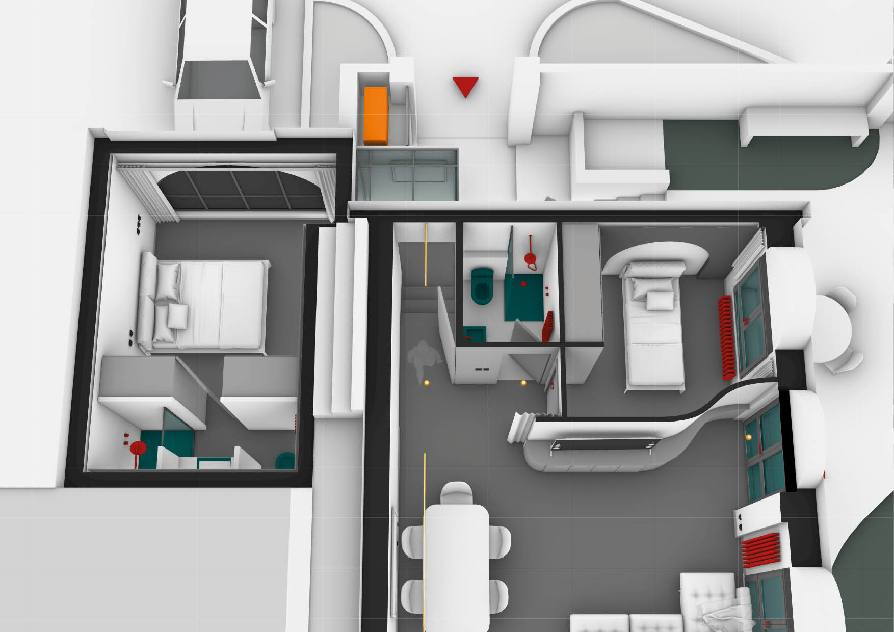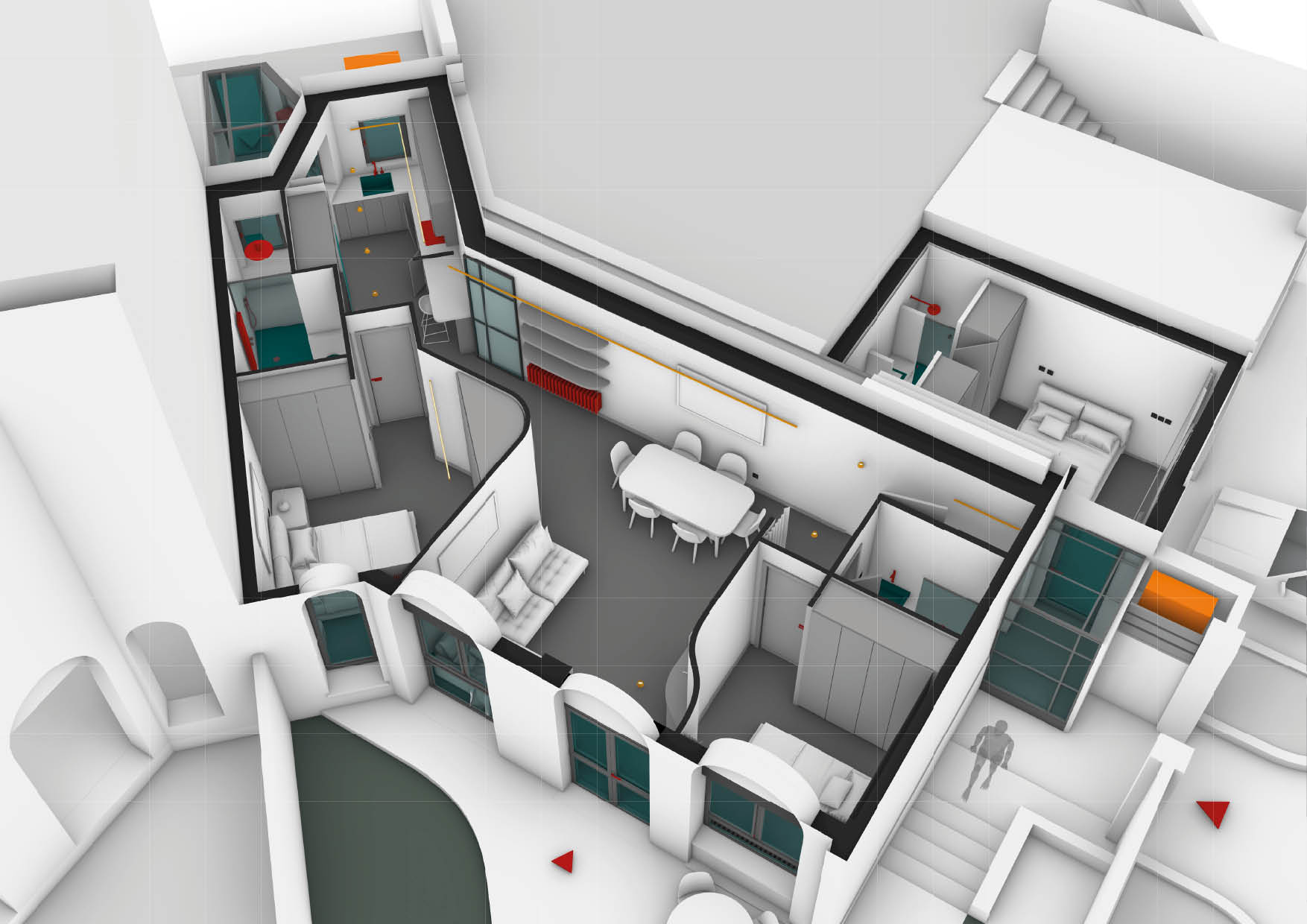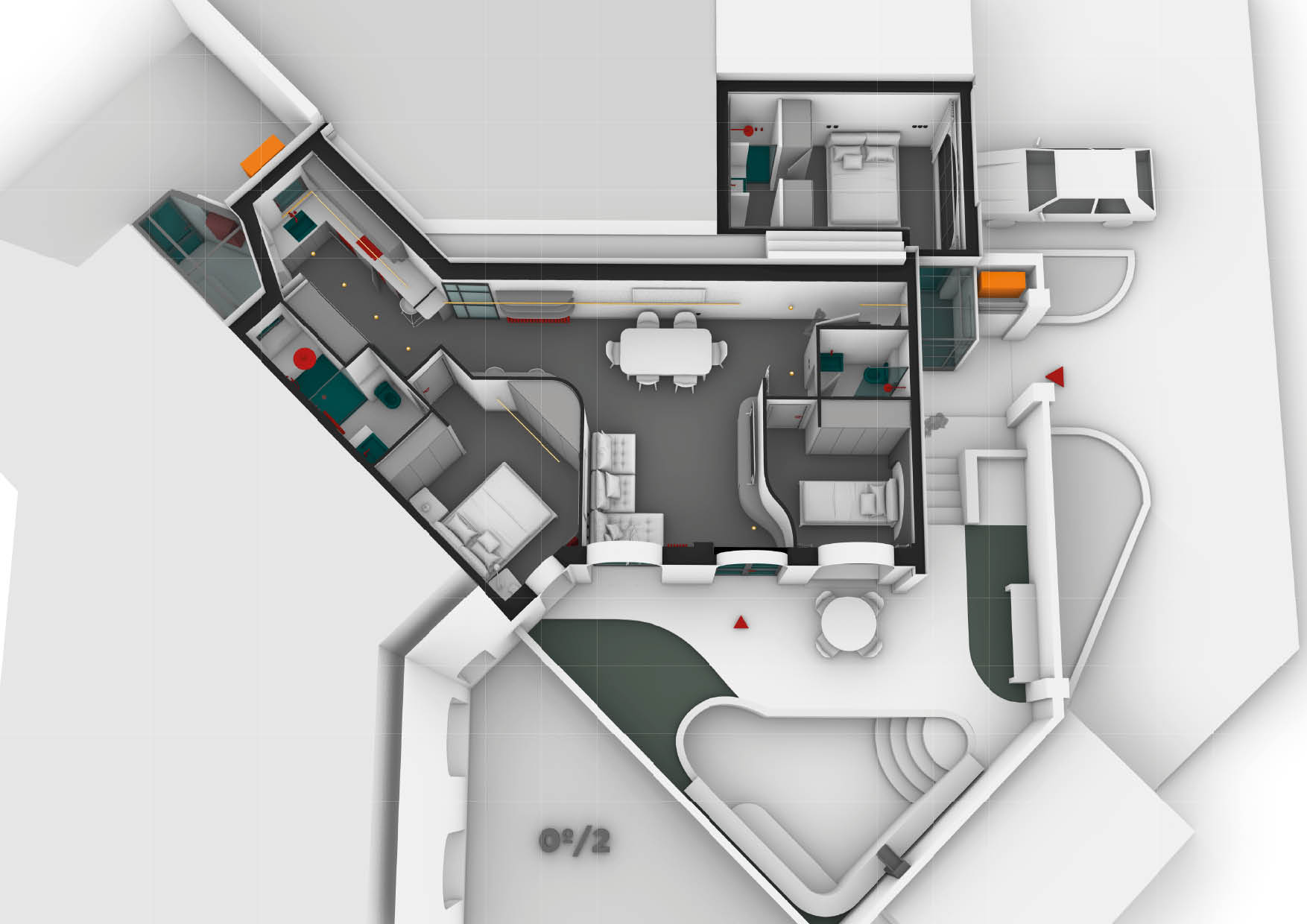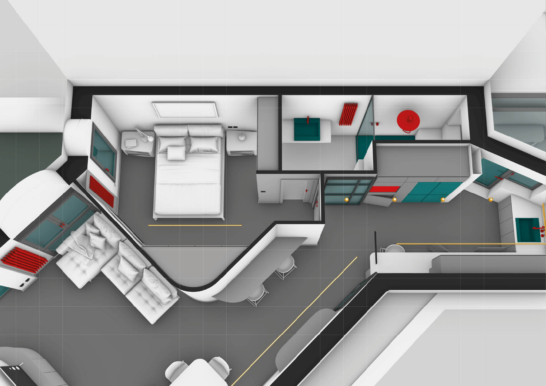 Es el momento de suavizar el módulo y armonizar la distribución del espacio. Las curvas del salón conectan las entradas, pasando por la cocina. No hay pasillos, solo un único volumen distribuidor.