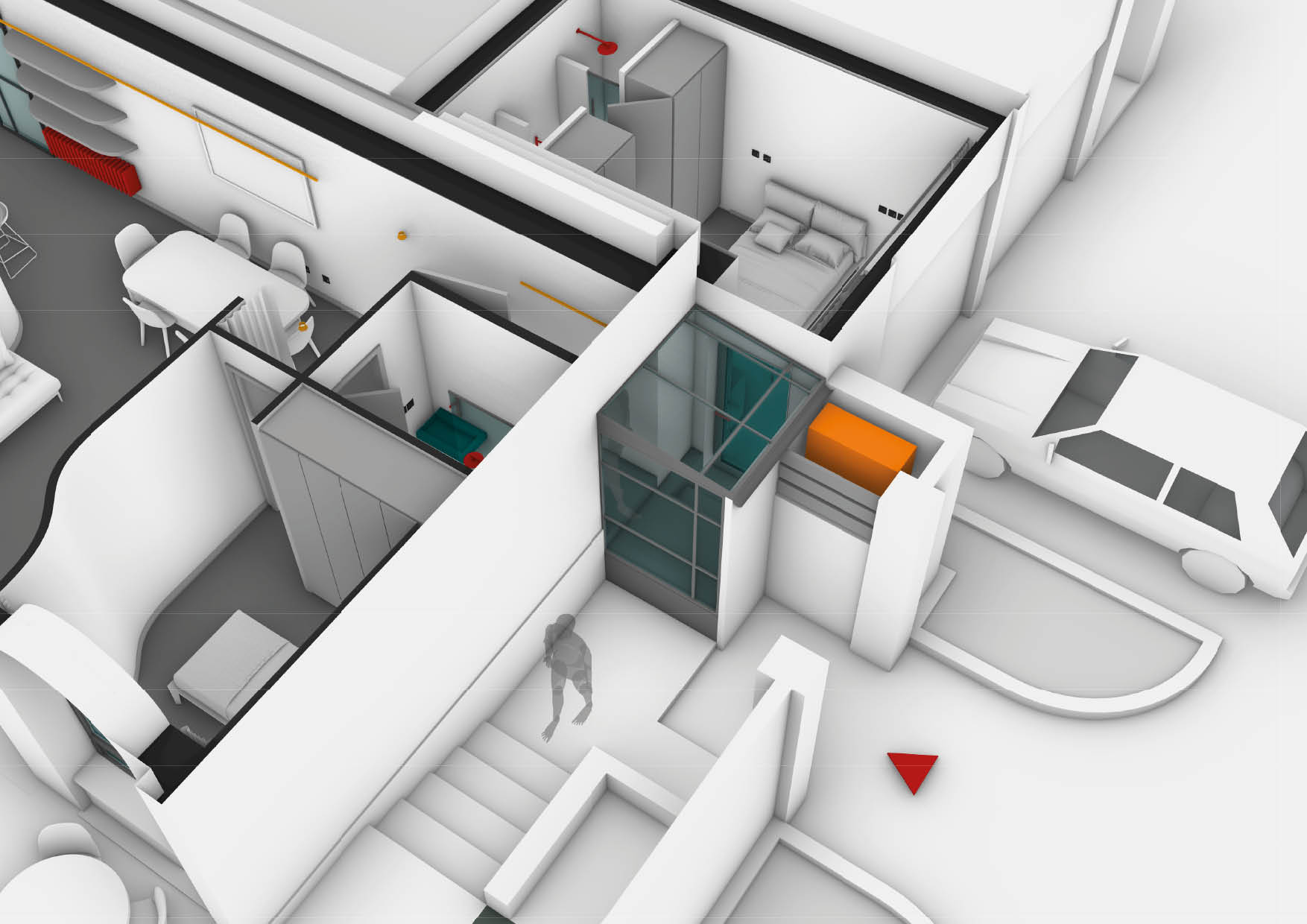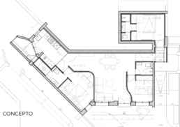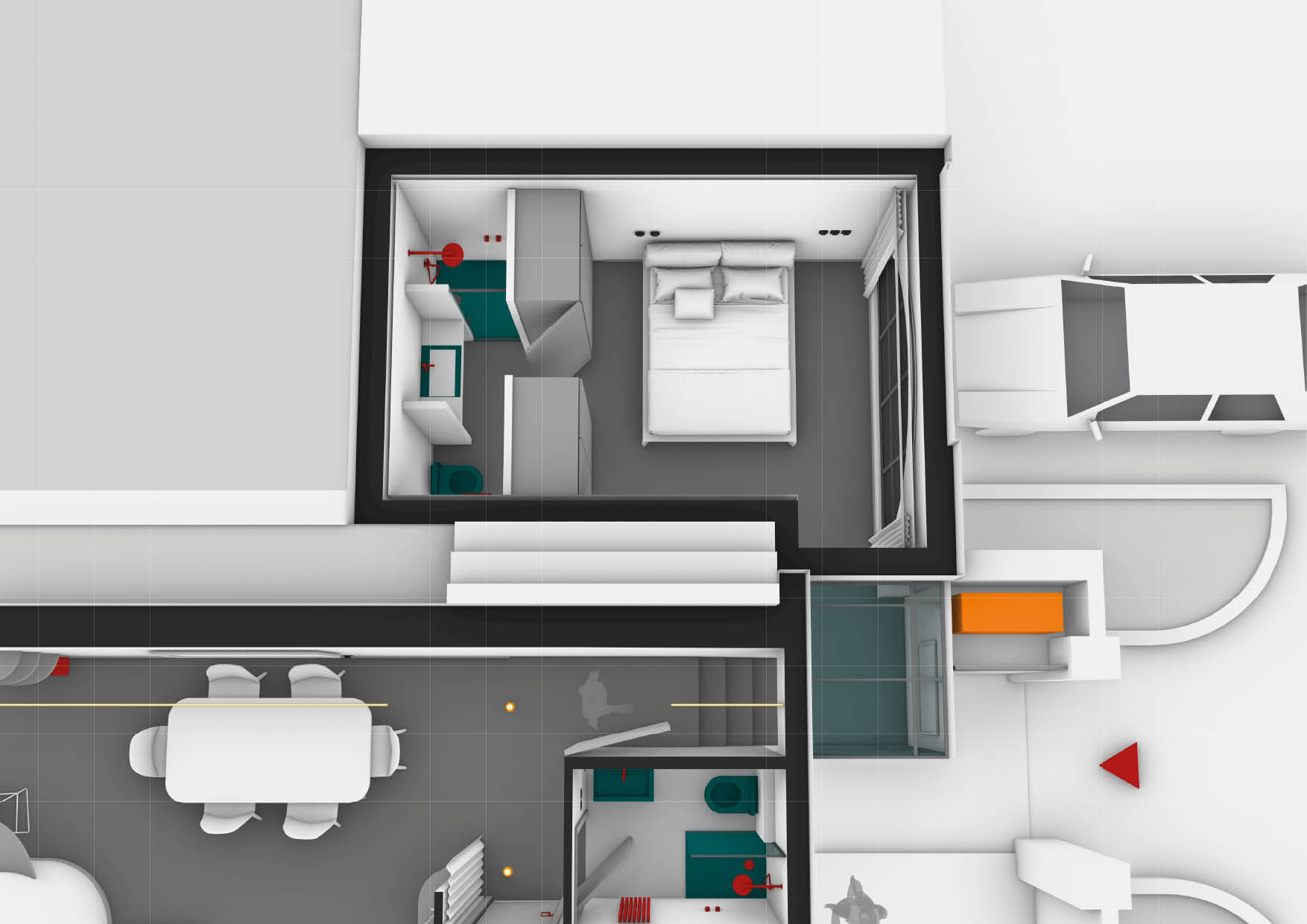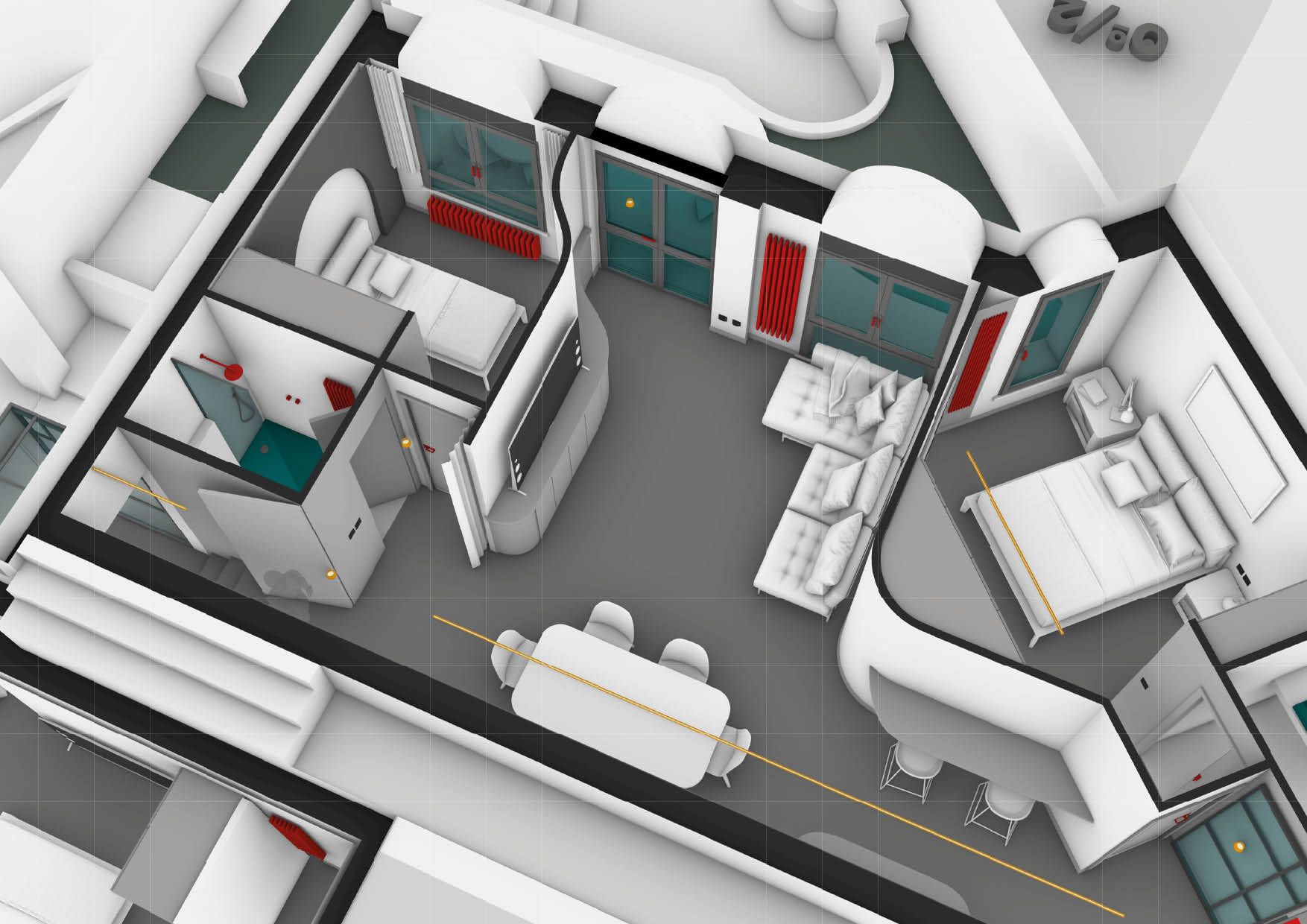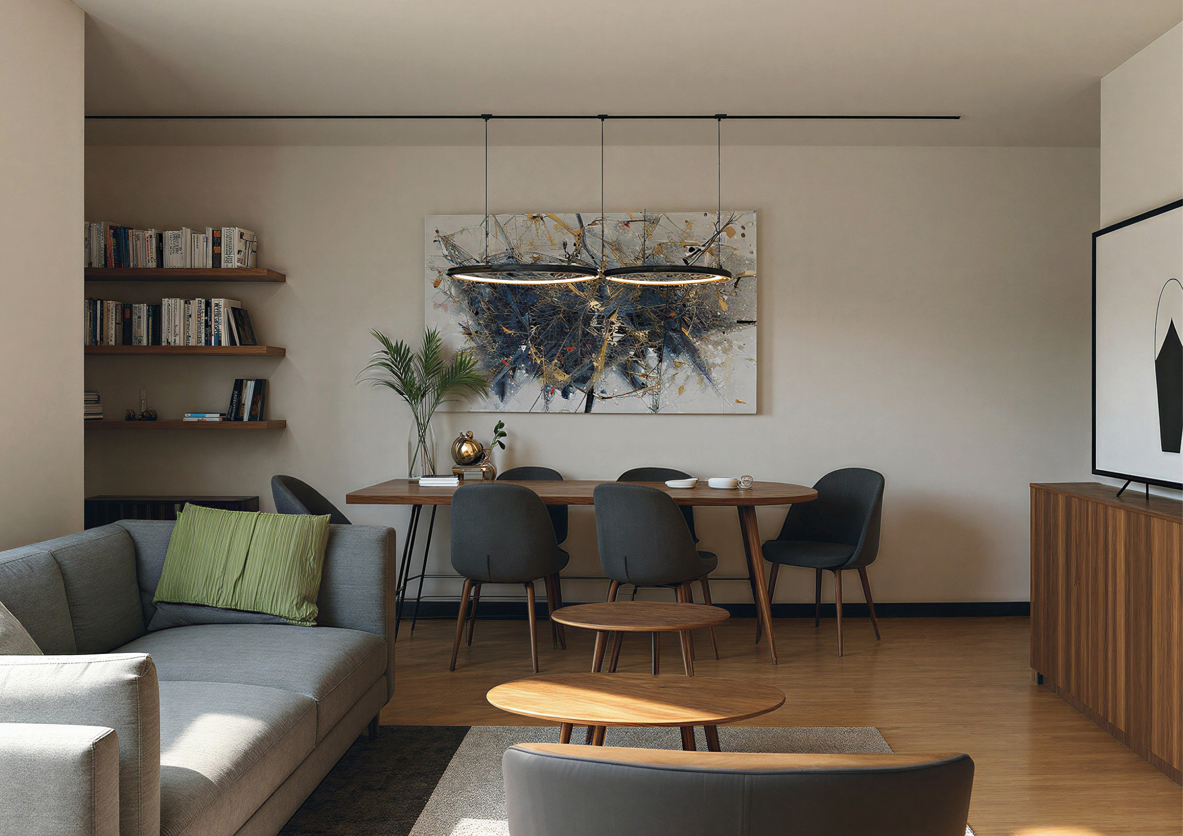 Es el momento de suavizar el módulo y armonizar la distribución del espacio. Las curvas del salón conectan las entradas, pasando por la cocina. No hay pasillos, solo un único volumen distribuidor.