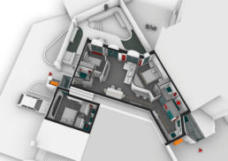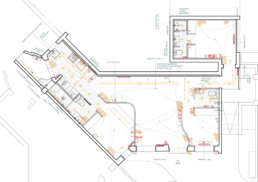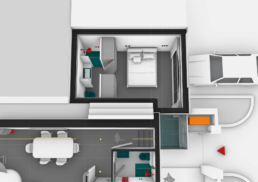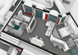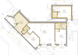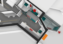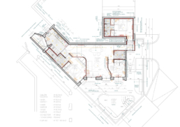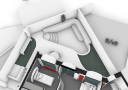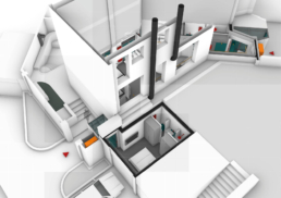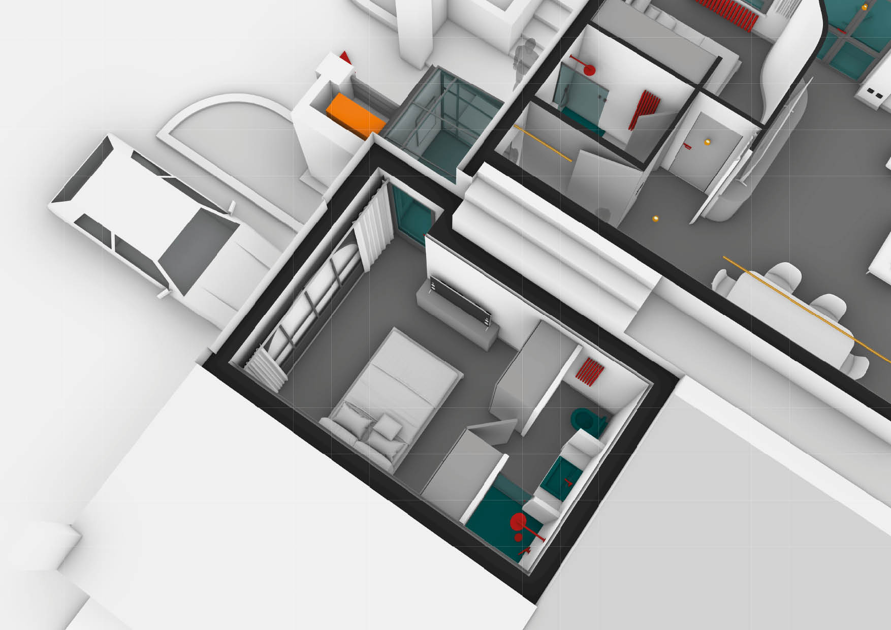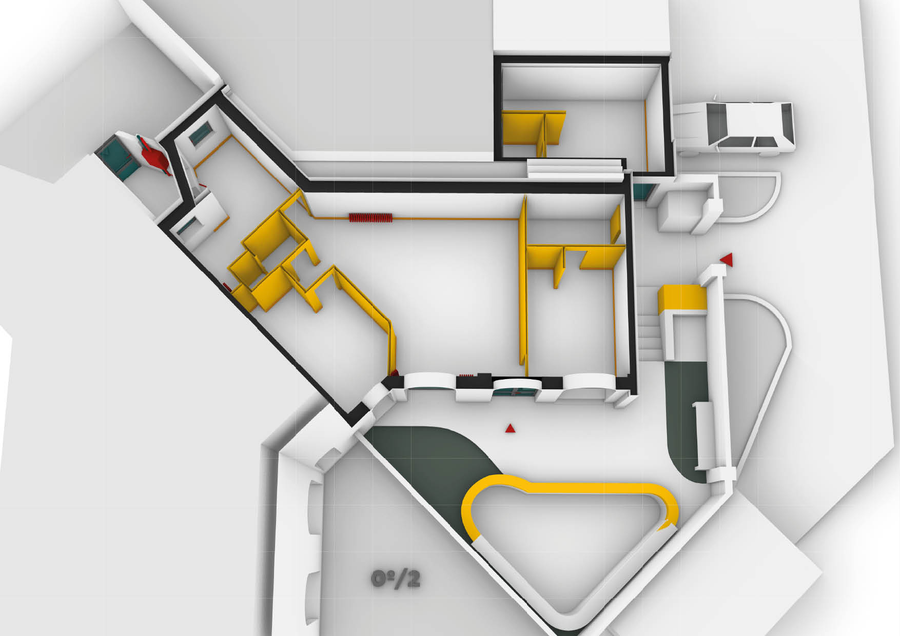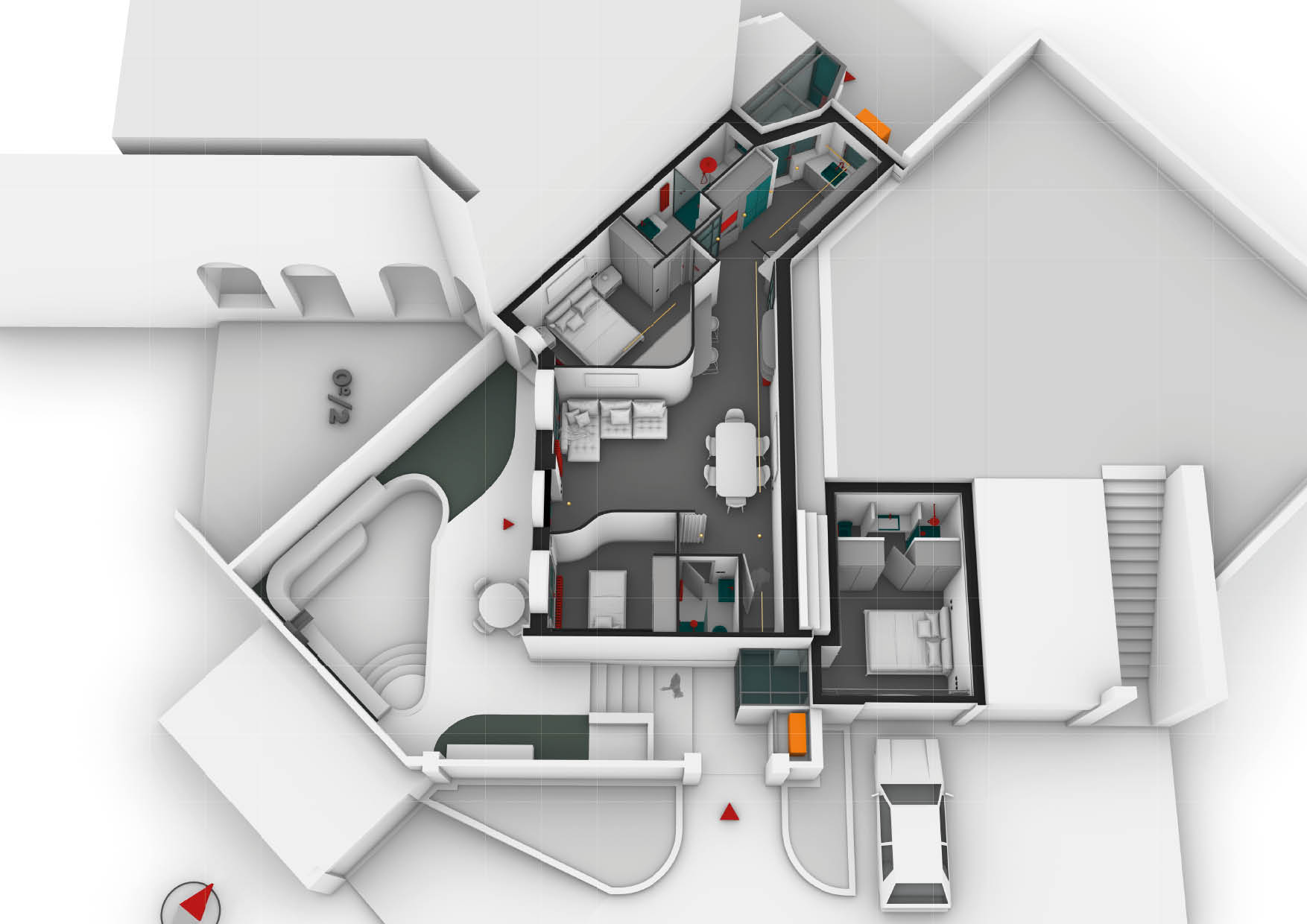 Es el momento de suavizar el módulo y armonizar la distribución del espacio. Las curvas del salón conectan las entradas, pasando por la cocina. No hay pasillos, solo un único volumen distribuidor.